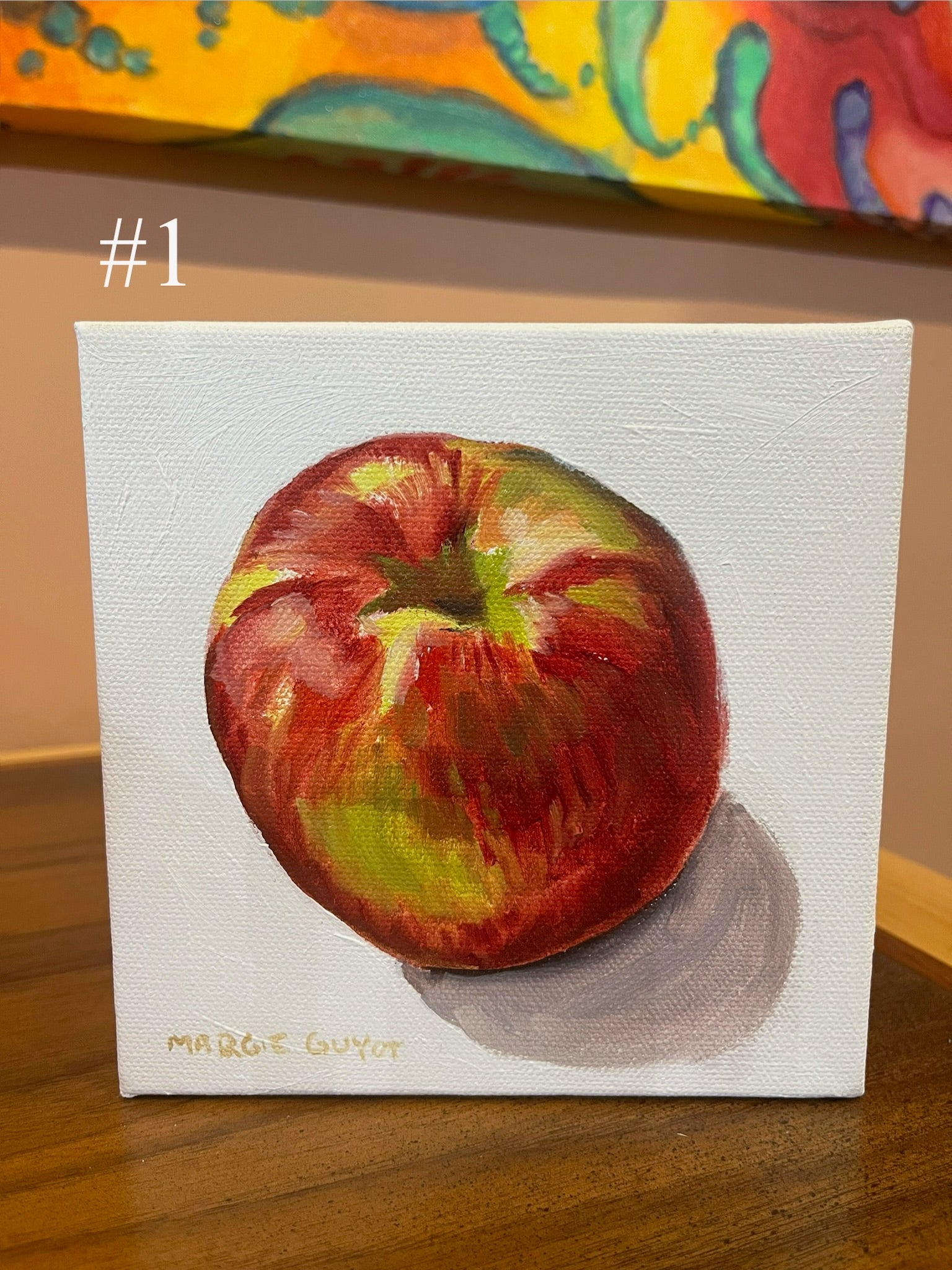 A single apple exquisite enough to eat on a small canvas suitable for hanging or displaying on a surface. Look through the photos to choose your favorite, or favorites. Beautiful individually or displayed in a group.